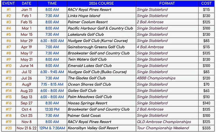 ‘The Tour’ season comprises 20 events played on some of the best courses available.  Play in as few or as many as you would like – no limitations, no obligations! To nominate to play in any event, please visit the 'How to Enter' Page.